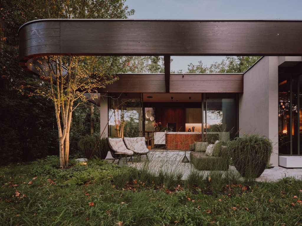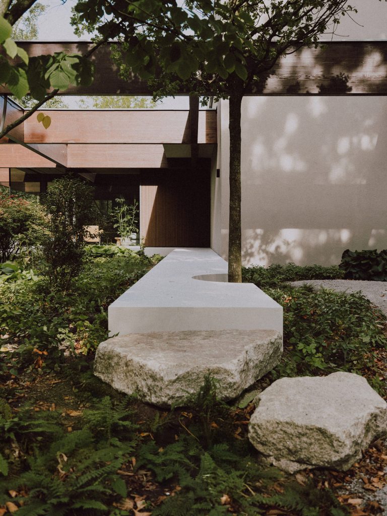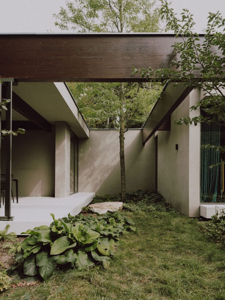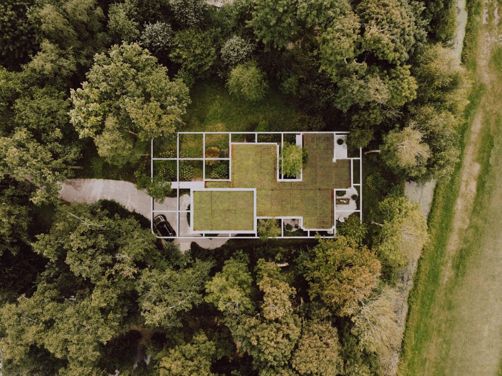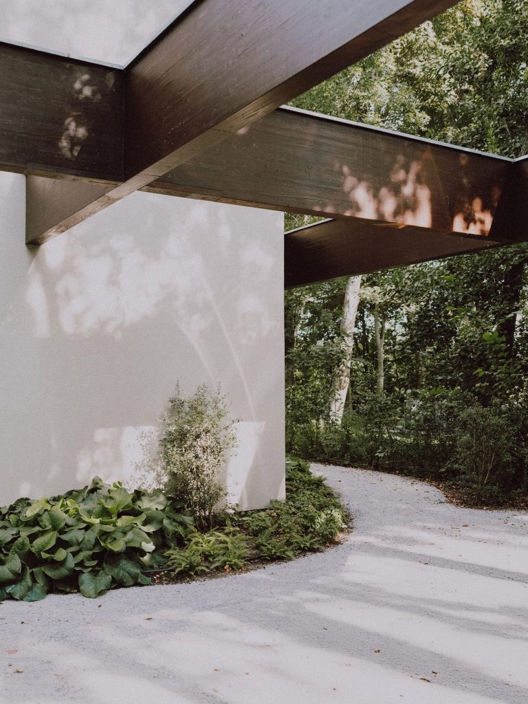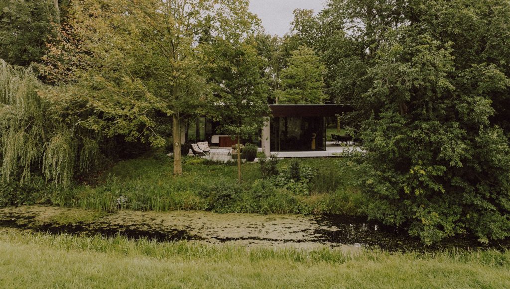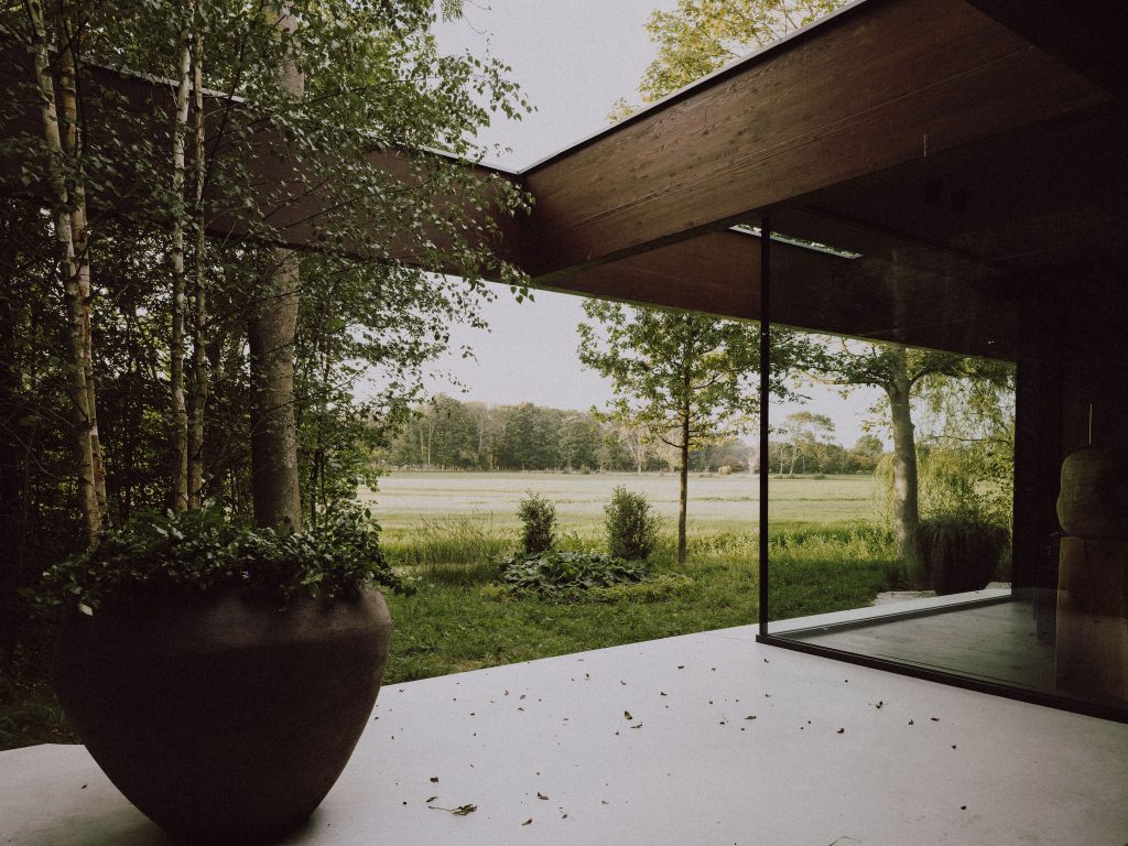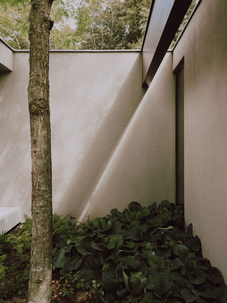 Iedere plek in de tuin ademt een tijdloze rust, alsof het bos langzaam het huis terugneemt, waarbij landschap en woning meesterlijk verweven één harmonieuze eenheid vormen.